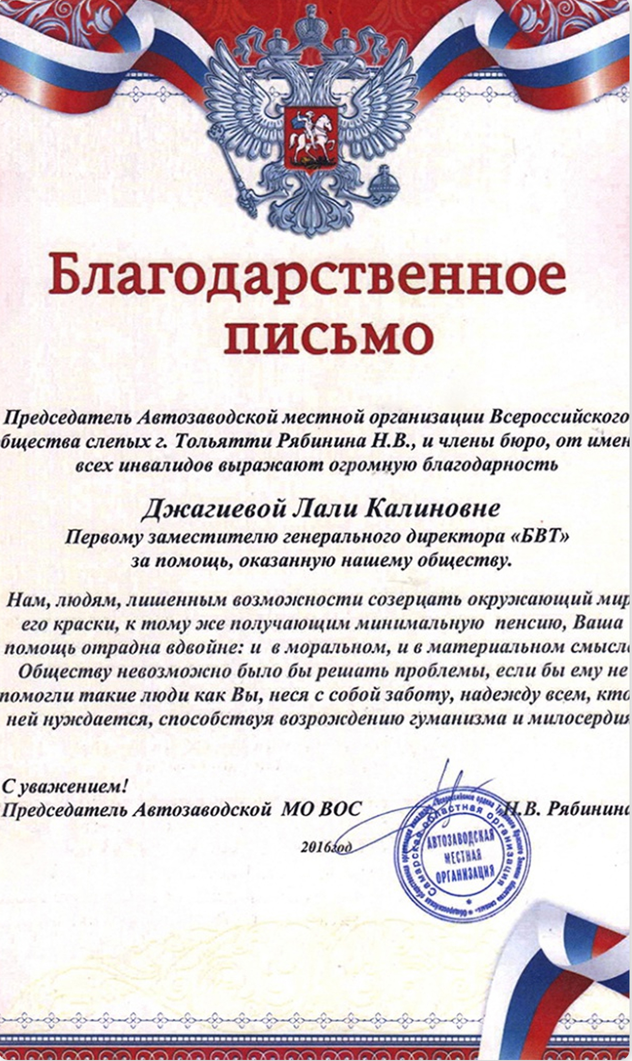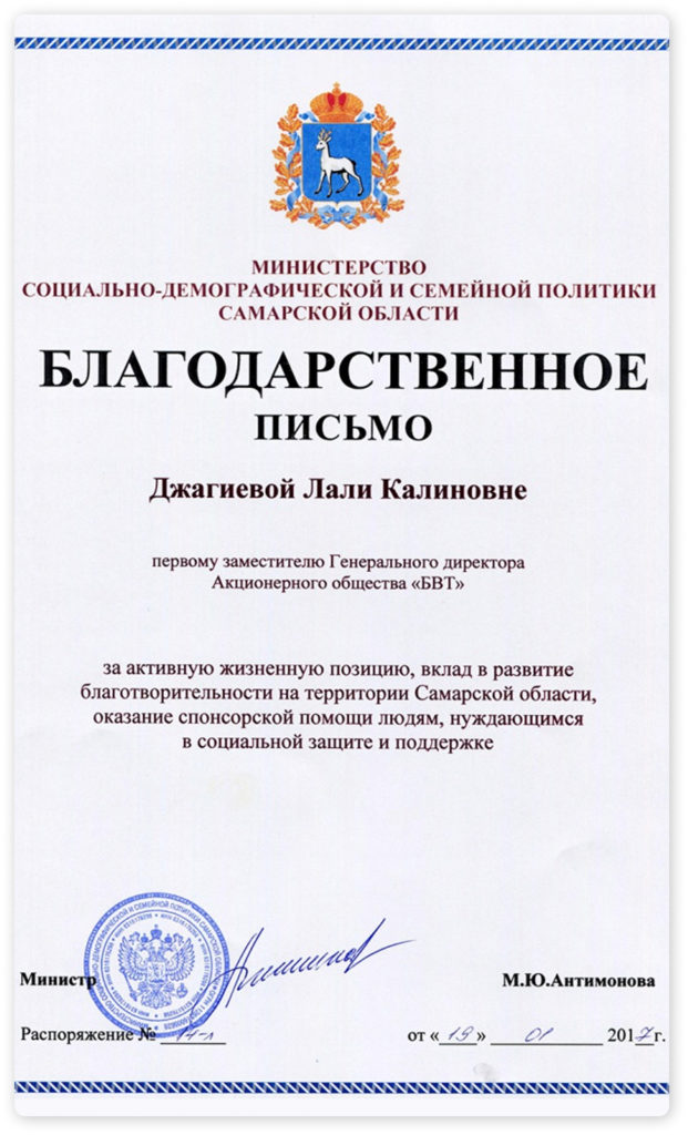 В течение долгого времени АО «БВТ» оказывает благотворительную помощь спортивному клубу инвалидов «Альфа» (г. Самара); оказывает поддержку Чапаевскому реабилитационному центру для детей и подростков с ограниченными возможностями «Надежда», а также является спонсором многочисленных футбольных турниров на территории городского округа Чапаевск, всероссийских турниров по хоккею с шайбой среди младших юношей и т.д.